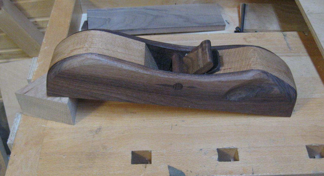 This is my second wooden plane, following Mr Finck's advice quite closely. The oak I got for it wasn't quite thick enough for a one-piece, so I made a virtue out of necessity and made the cheeks out of walnut, with the crosspin and wedge to match. The blade is a 1 1/2″ honey from Ron Hock. This is lovely to use.