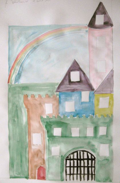 It's my youngest daughter's second birthday next month, so I am making her a fairy castle picture frame- each window will have a photo of a family member in it. The watercolour is the basic sketch I'm working off, though there are some changes occurring between the painting and actually cutting wood.