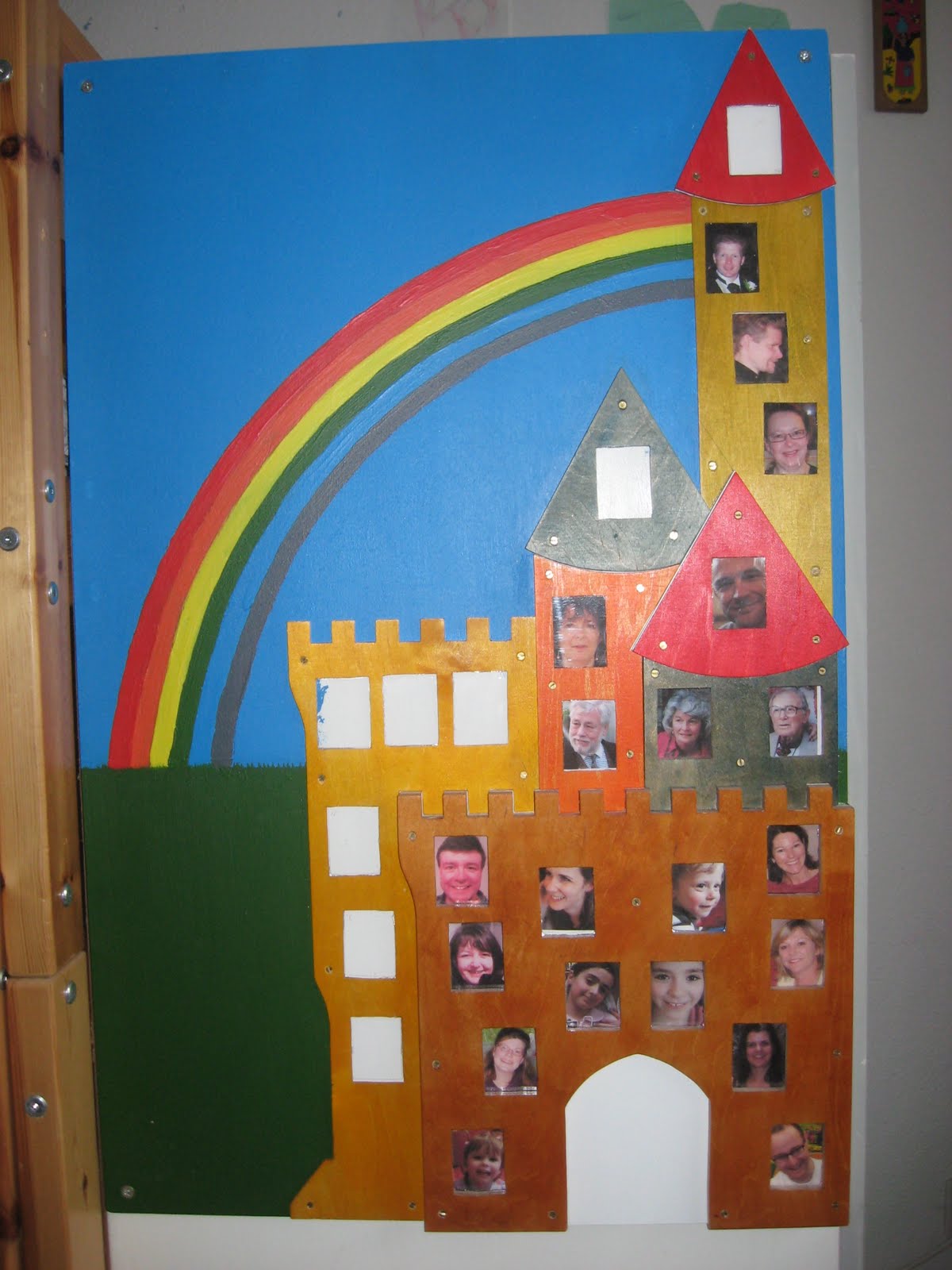 Painting the background was, for me, probably the most challenging part- freehanding a rainbow is not for the unsteady of hand. Then choosing, editing and printing out all the little pictures of relatives and godparents was extremely tedious- and as you see we still don't have everyone's window filled.