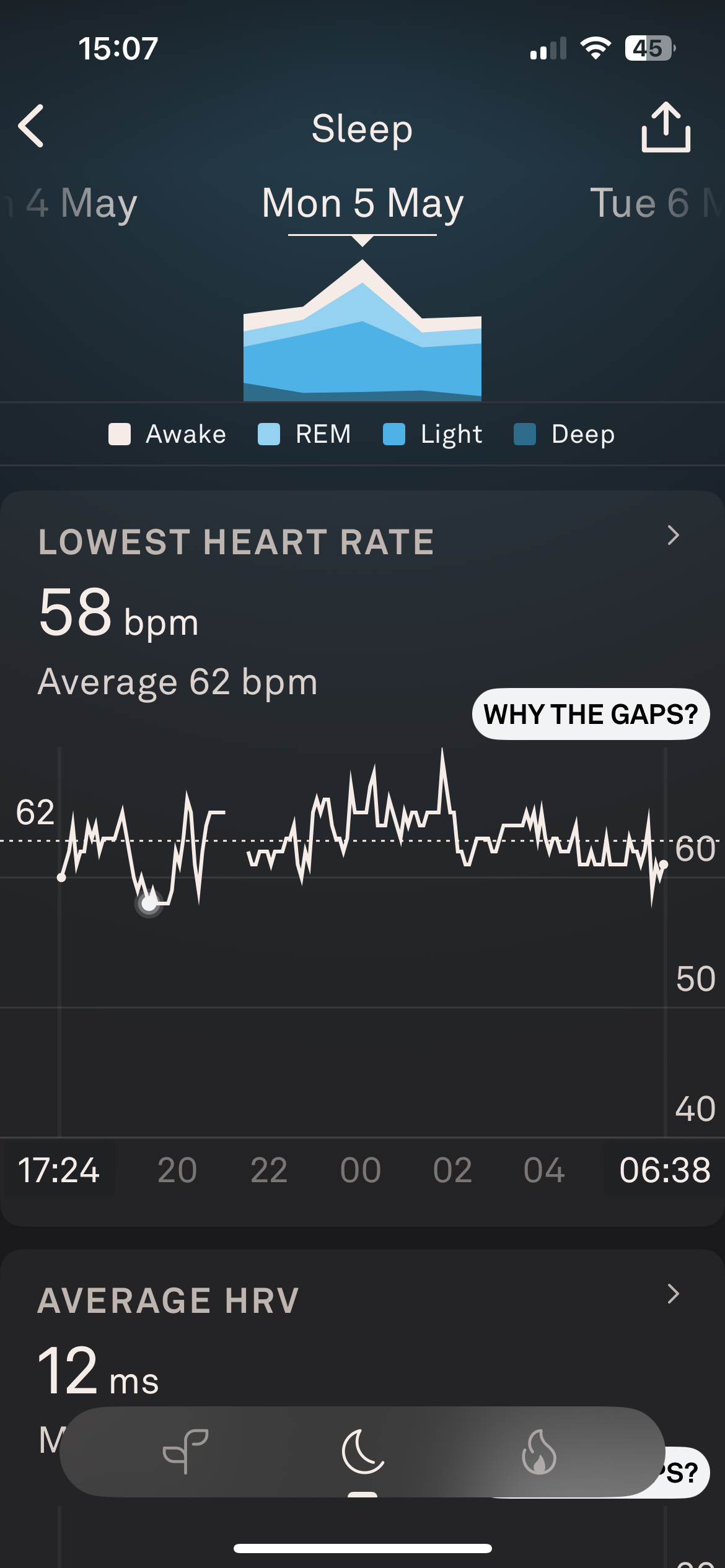 So whether I actually feel better or not, it’s really obvious that my heart prefers me to not drink at all. I mean, average HR 45, lowest 42, that’s pretty decent. Generally speaking, any night when I haven’t drunk any alcohol, it’ll average something below 50, and get down to 45 or below.