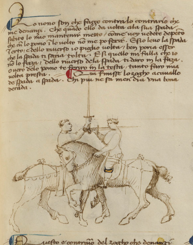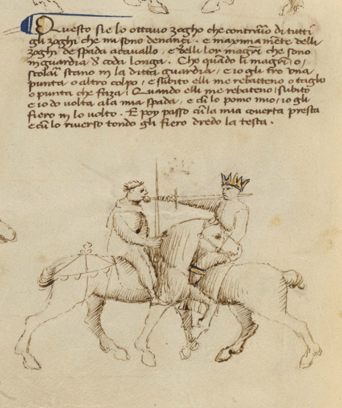 Questo si è lo ottavo zogho ch’è contrario di tutti gli zoghi che mi sono denançi, e maximamente delli zoghi de spada a cavallo e delli lor magistri che sono in guardia d’coda longa. Che quando li magistri o scolari stano in la ditta guardia, e io gli t(i)ro una punta o altro colpo, e subito elli me rebatteno o taglio o punta che faza. quando elli me rebateno subito e io dò volta ala mia spada e cum lo pomo mio, io gli fiero in lo volto. E poy passo cum la mia coverta presta e cum lo riverso tondo gli fiero dredo la testa.