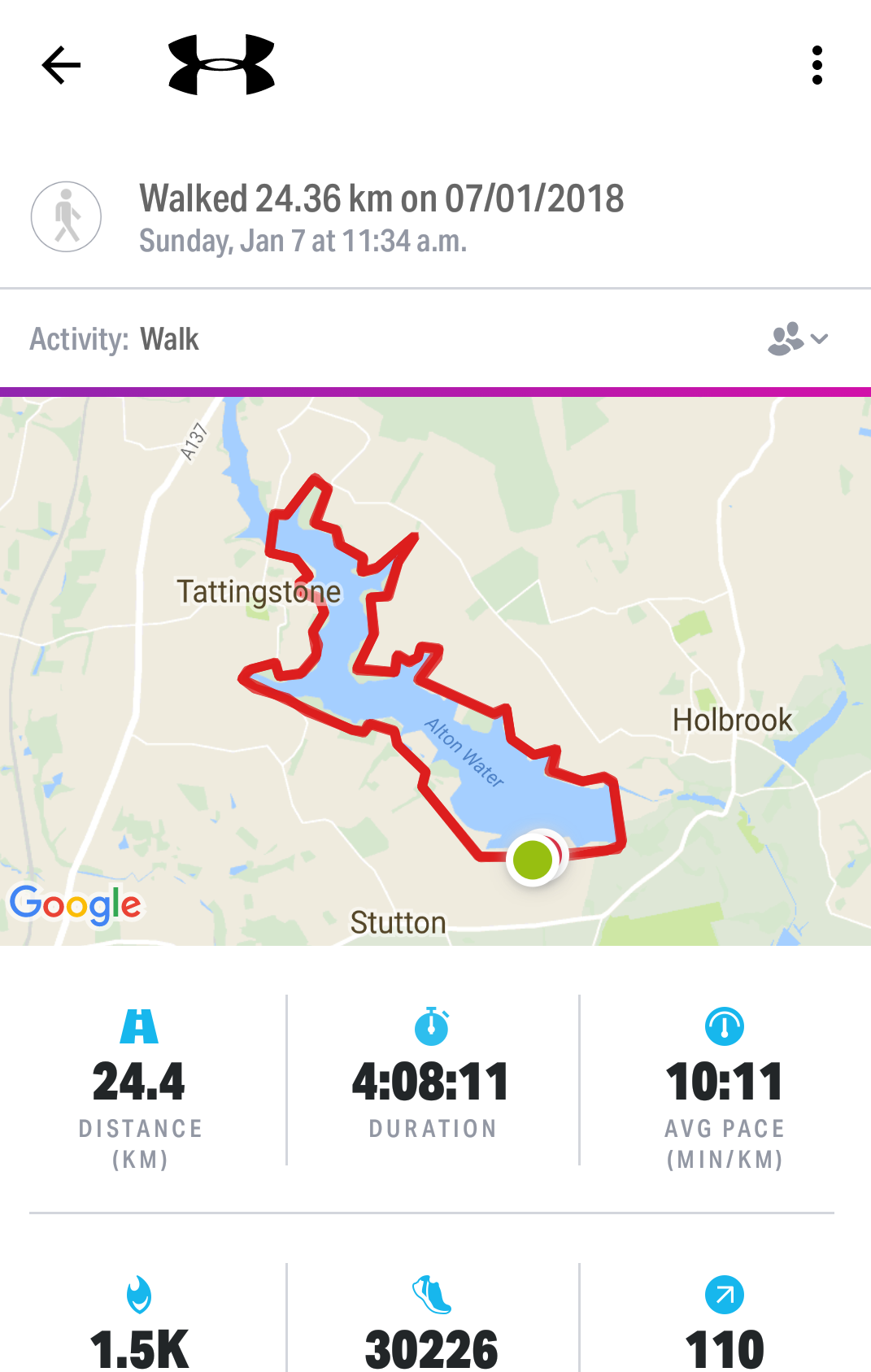 I tend to walk everywhere anyway. On a day when I don’t train at all, I’ll more likely than not walk about 10k (according to my motion-tracking ring of power), taking my kids to and from school, and walking to the office and back. On a recent trip to London I needed to get from the hospital where I was visiting my mother in law, to the pub I was having dinner in, about four miles away. It seemed easier to walk it than to fiddle about with tubes and busses. But four miles is not 70. The big problem with going on long training walks is the time they take. I’m used to being able to hit most of my training goals in under an hour’s work. Fortunately, the current trend in training for races is not to cover the total distance (even for short sprints like the 100m). I recently went on a 24km training walk around Alton Water (a convenient beauty spot, with a footpath circuit) which served as a useful diagnostic for the efficacy of my current approach. Two laps of Alton Water covers 24km, and took me four hours, plus half an hour each side for getting there and back. Five hours spent, and it’s less than a quarter of the total distance I’ll be covering in May. (I'm using the Map My Walk app on my android phone to measure training walks. It seems quite accurate, and gives useful data, like elevation as well as distance.)