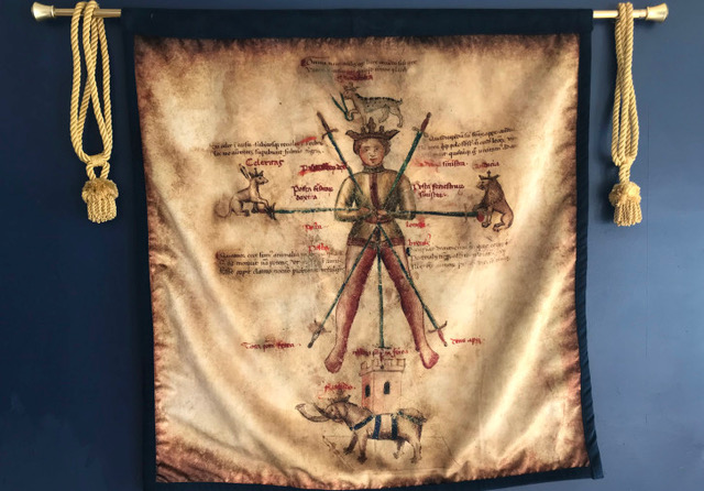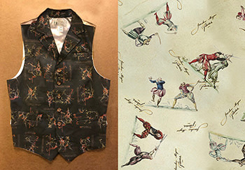 She is producing everything from wall-hangings to waistcoats, in glorious sword-themed fabrics.