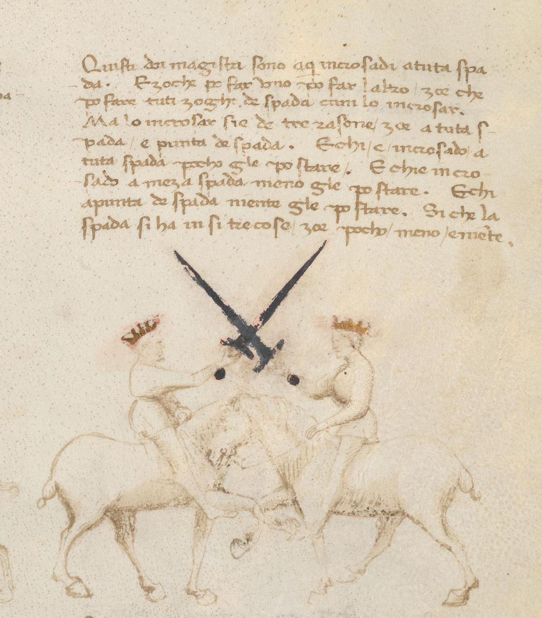 Quisti doi magistri sono aqui incrosadi a tuta spada. E zoche po far uno por far l’altro, zoe che po fare tuti zoghi de spada cum lo incrosar. Ma lo incrosar sie de tre rafone, zoe a tuta spada e punta de spada. E chi e incrosado a tuta spada pocho gle po stare. E chi’e incrosado a meza spada meno gle po stare. E chi a punta de spada niente gle po stare. Si che la spada si ha in si tre cose, zoe, pocho, meno, e niente.