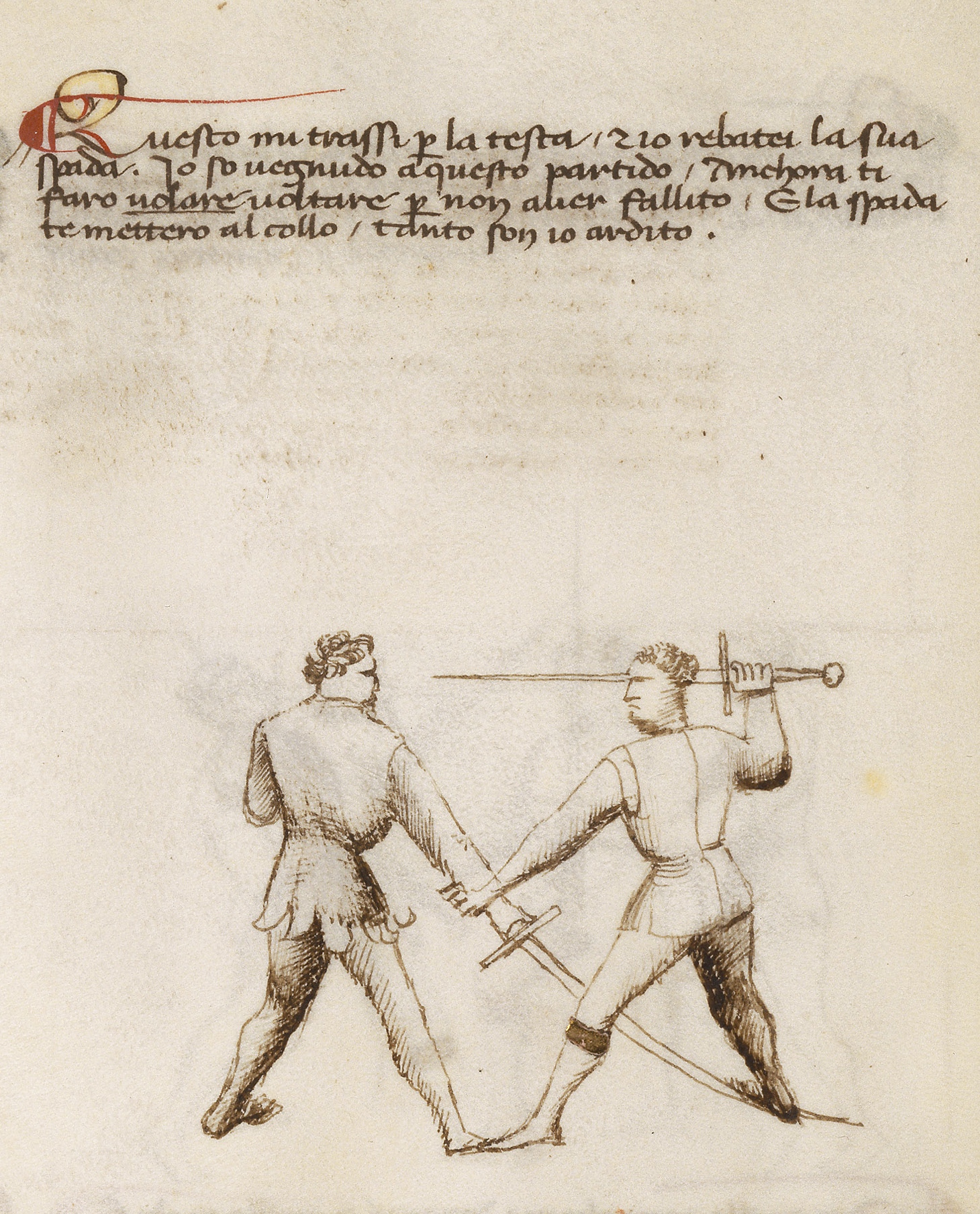 Questo mi trassi per la testa e io rebater la sua spada. Io so vegnudo aquesto partido. Anchora ti faro volare voltare per non aver fallito. E la spada te mettero al collo, tanto son io ardito.