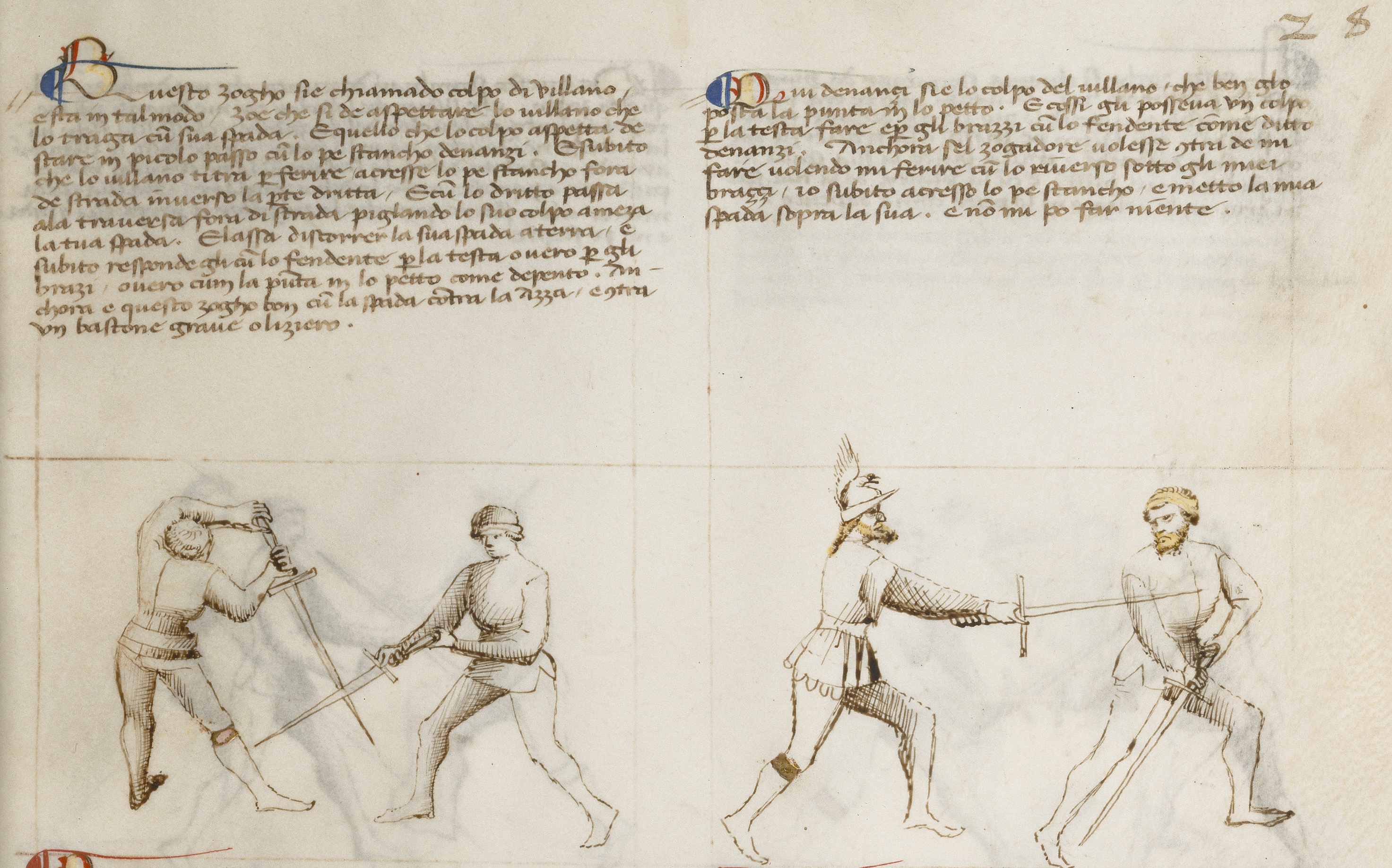 Questo zogho sie chiamado colpo di villano, e sta in tal modo, zoe, che si de aspettare lo villano che lo traga cum sua spada, e quello che lo colpo aspetta de stare in picolo passo cum lo pe stancho denanzi. E subito che lo villano ti tra per ferire acresse lo pe stancho fora de strada inverso la parte dritta. E cum lo dritto passa ala traversa fora di strada piglando lo suo colpo a meza la tua spada. E lassa discorrer la sua spada a terra e subito responde gli cum lo fendente per la testa o vero per gli brazi, overo cum la punta in lo petto come depento. Anchora e questo zogho bon cum la spada contra la azza, e ntra un bastone grave o liziero.