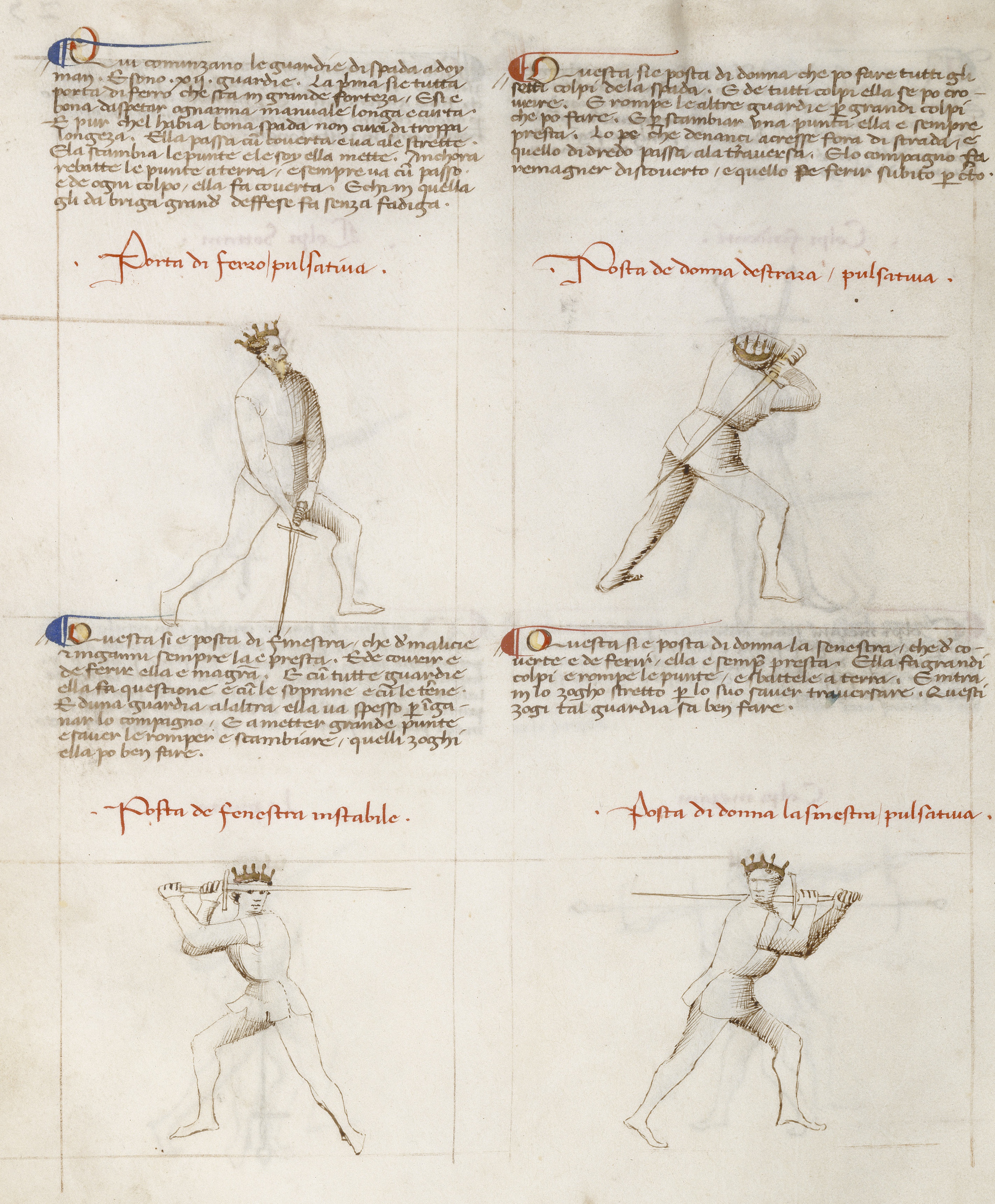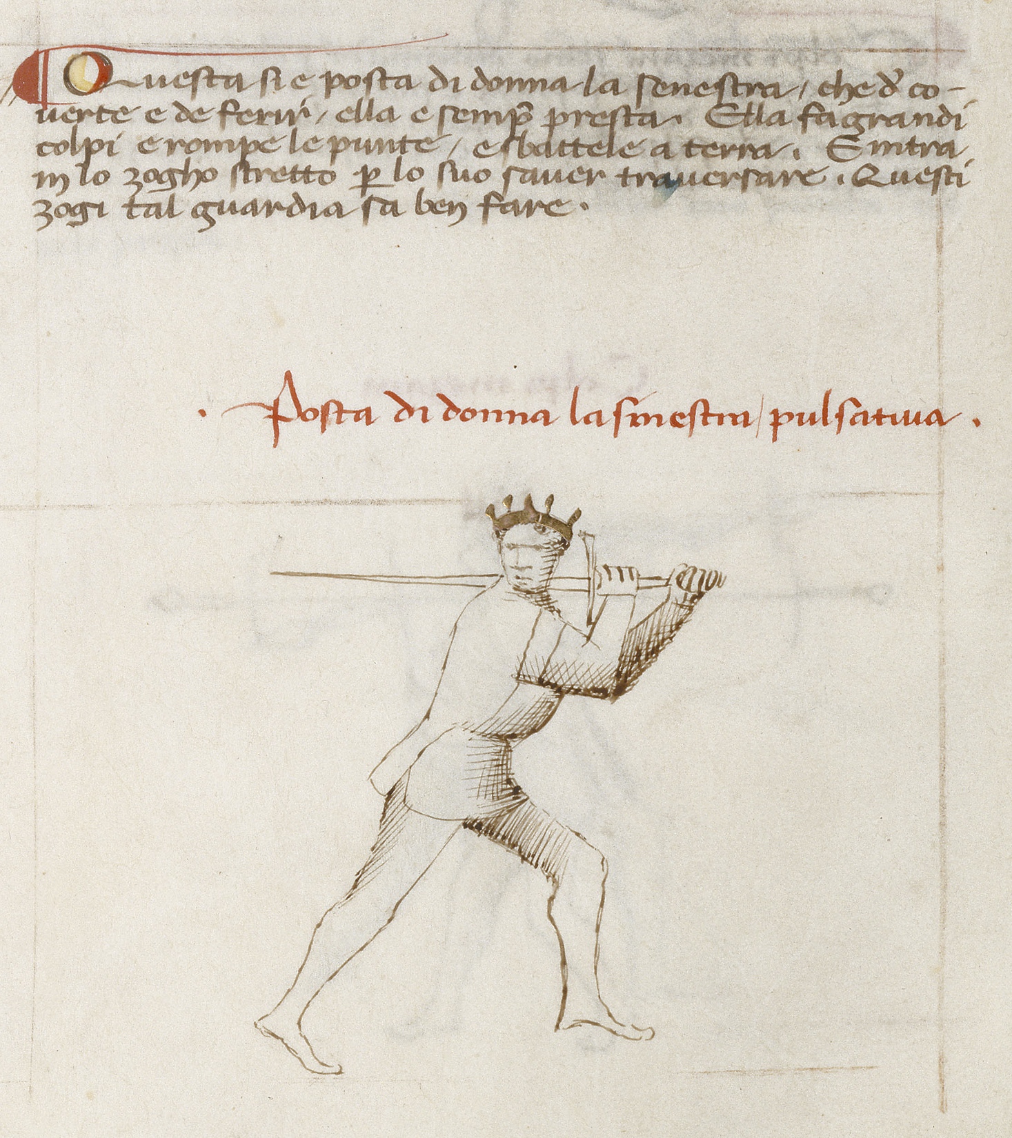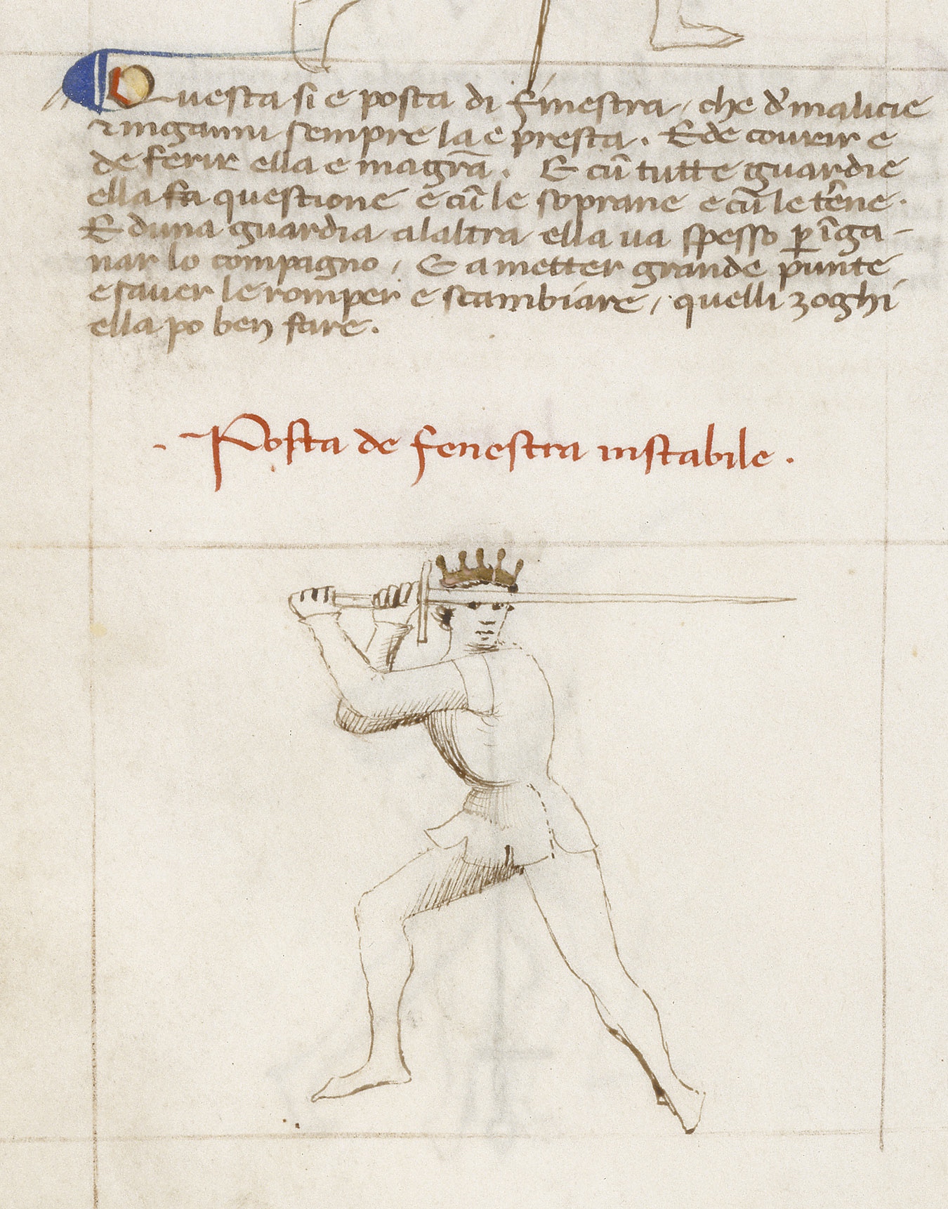 Posta di fenestra son chiamata la sinestra, uno picolo brazo se fa de mi ala destra. Noy non avemo stabilita. Una e l’altra cerca la falsita. Tu credera che io vegna cum lo fendente, e io tornero un pe in dredo e mi mudero di posta. La che era in la sinestra io entrero in la destra. E crezo entrare in gli zoghi che vegneno dredo ben presta.