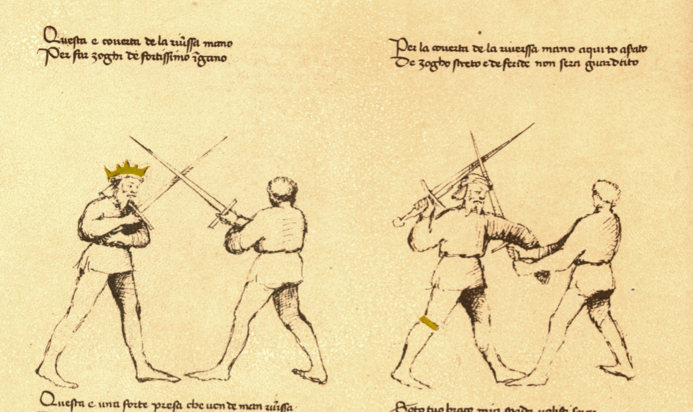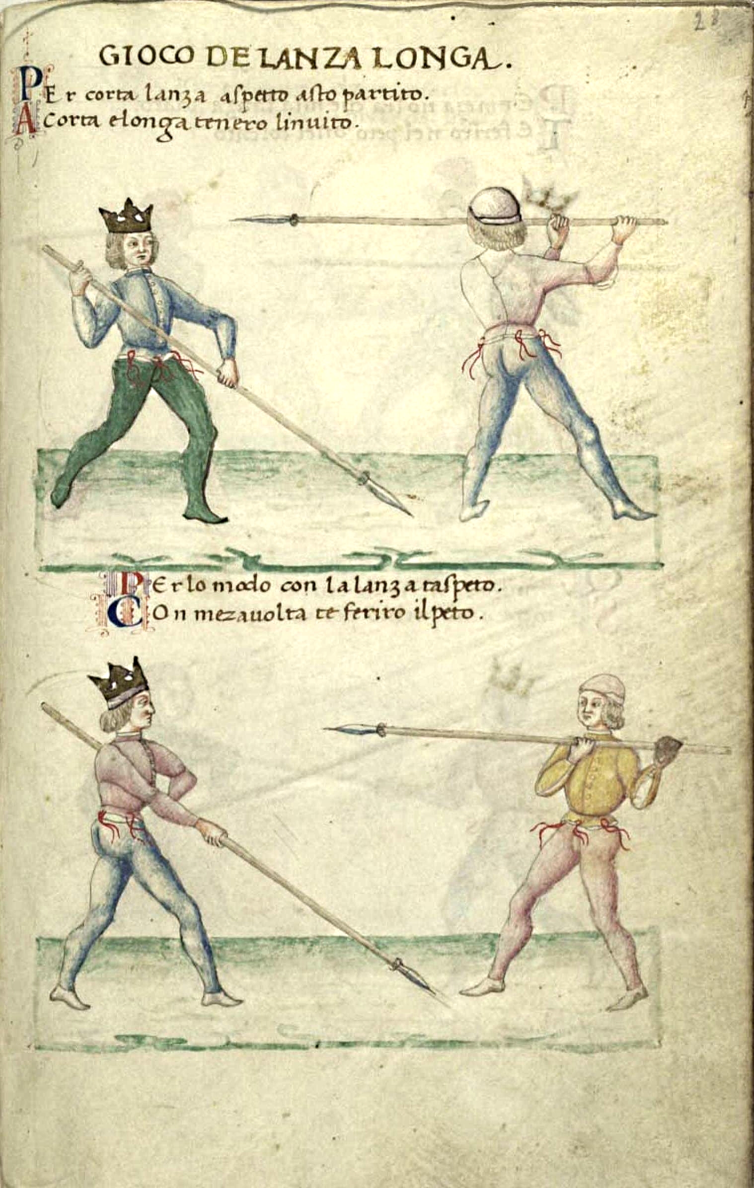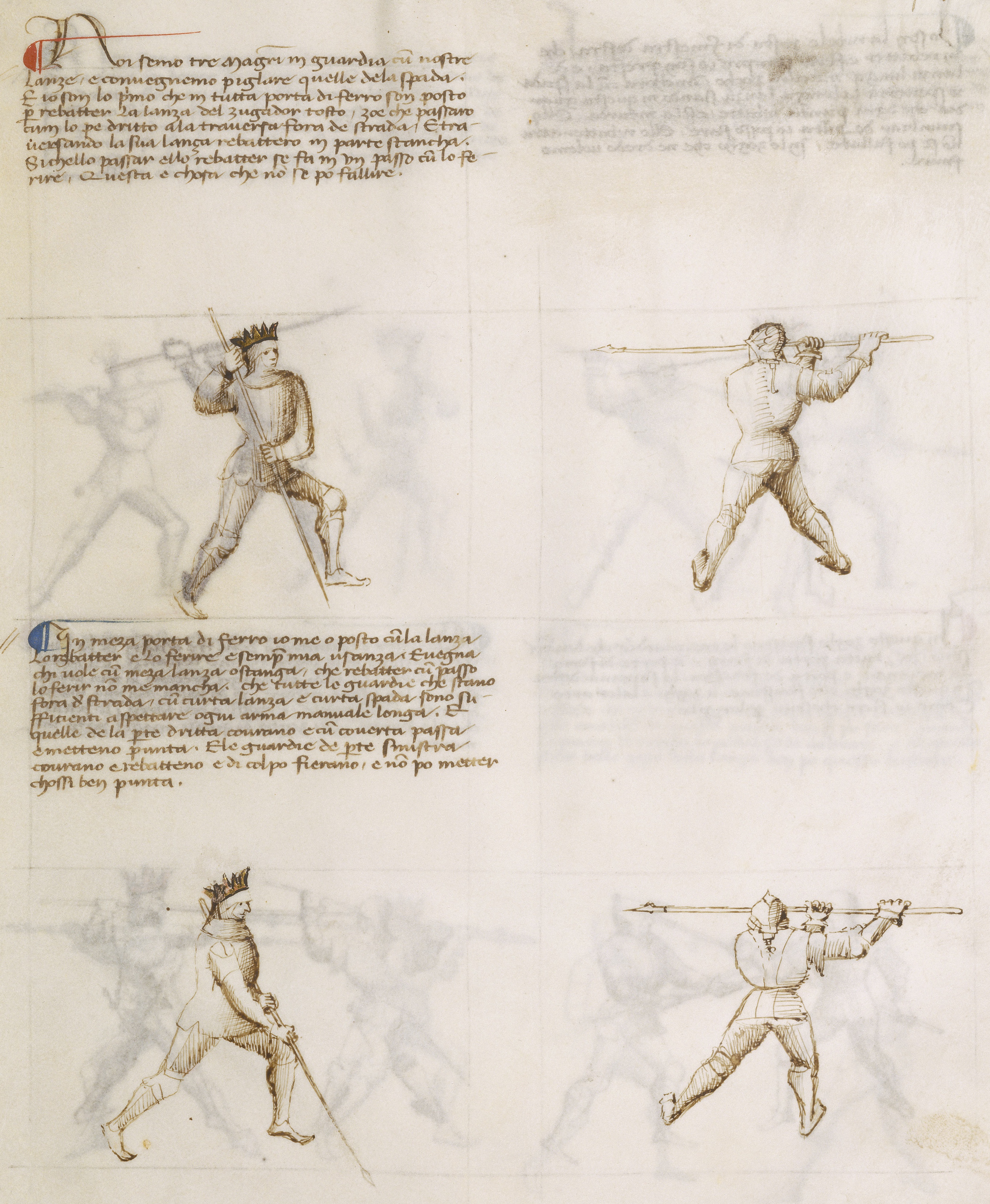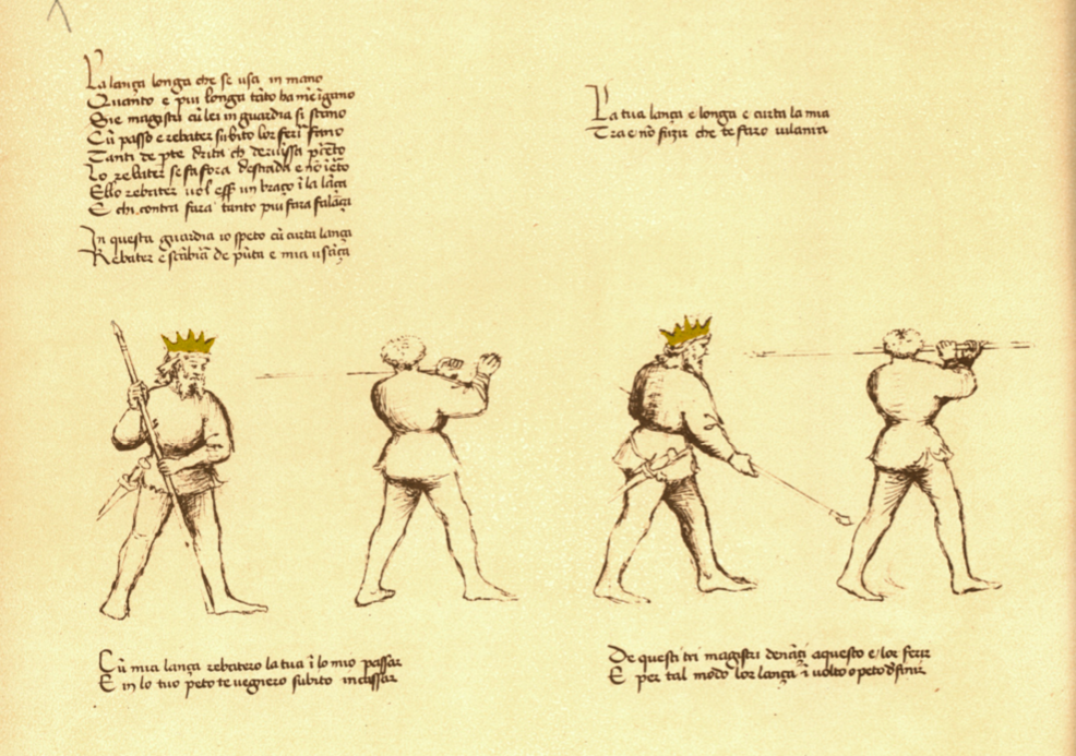Posta di fenestra son chiamata la sinestra, uno picolo brazo se fa de mi ala destra. Noy non avemo stabilita. Una e l’altra cerca la falsita. Tu credera che io vegna cum lo fendente, e io tornero un pe in dredo e mi mudero di posta. La che era in la sinestra io entrero in la destra. E crezo entrare in gli zoghi che vegneno dredo ben presta.