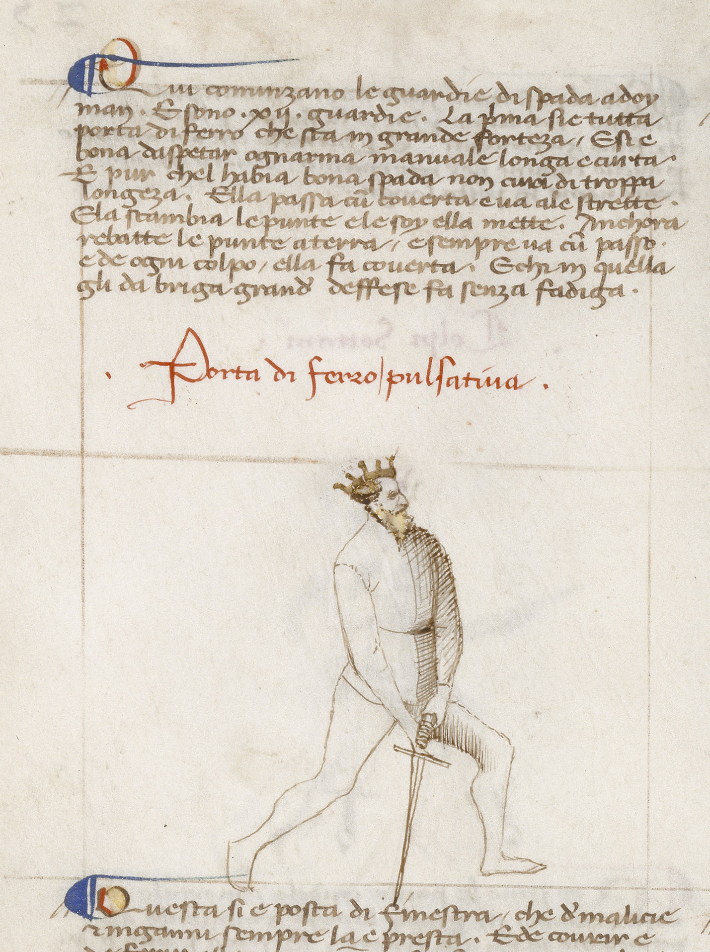 Qui comminzano le guardie di spada a doy man. E sono xii guardie. La prima sie tutta porta di ferro che sta in grande forteza. Esi e bona d’aspetar ogn’arma manuale longa e curta. E pur ch’el habia bona spada non cura di troppa longeza. Ella passa cum coverta e va ale strette. E la scambi le punte e le soy ella mette. Anchora rebatte le punte a terra e sempre va cum passo e de ogni colpo ella fa coverta. E chi in quella gli da briga grand’ deffese fa senza fadiga.