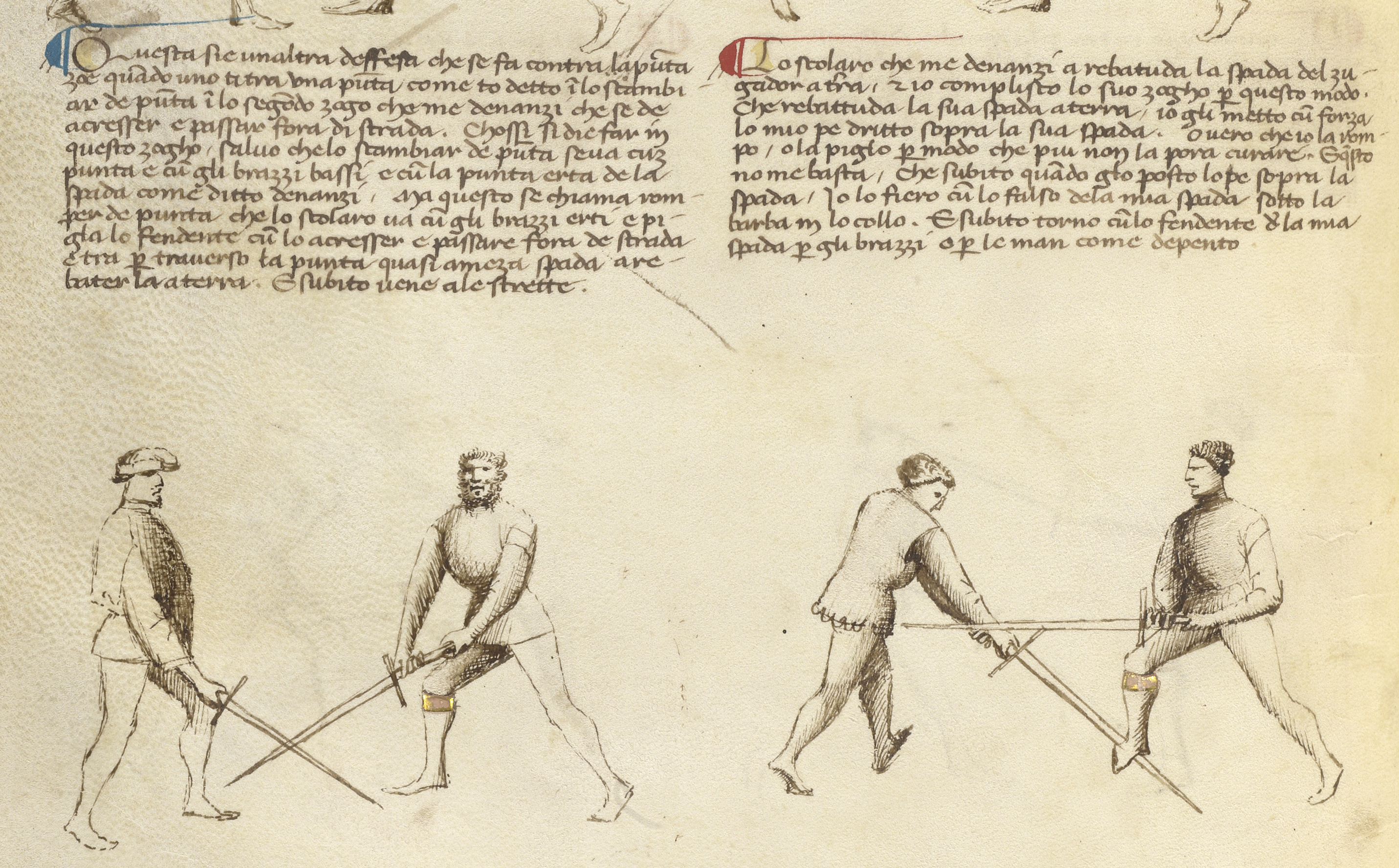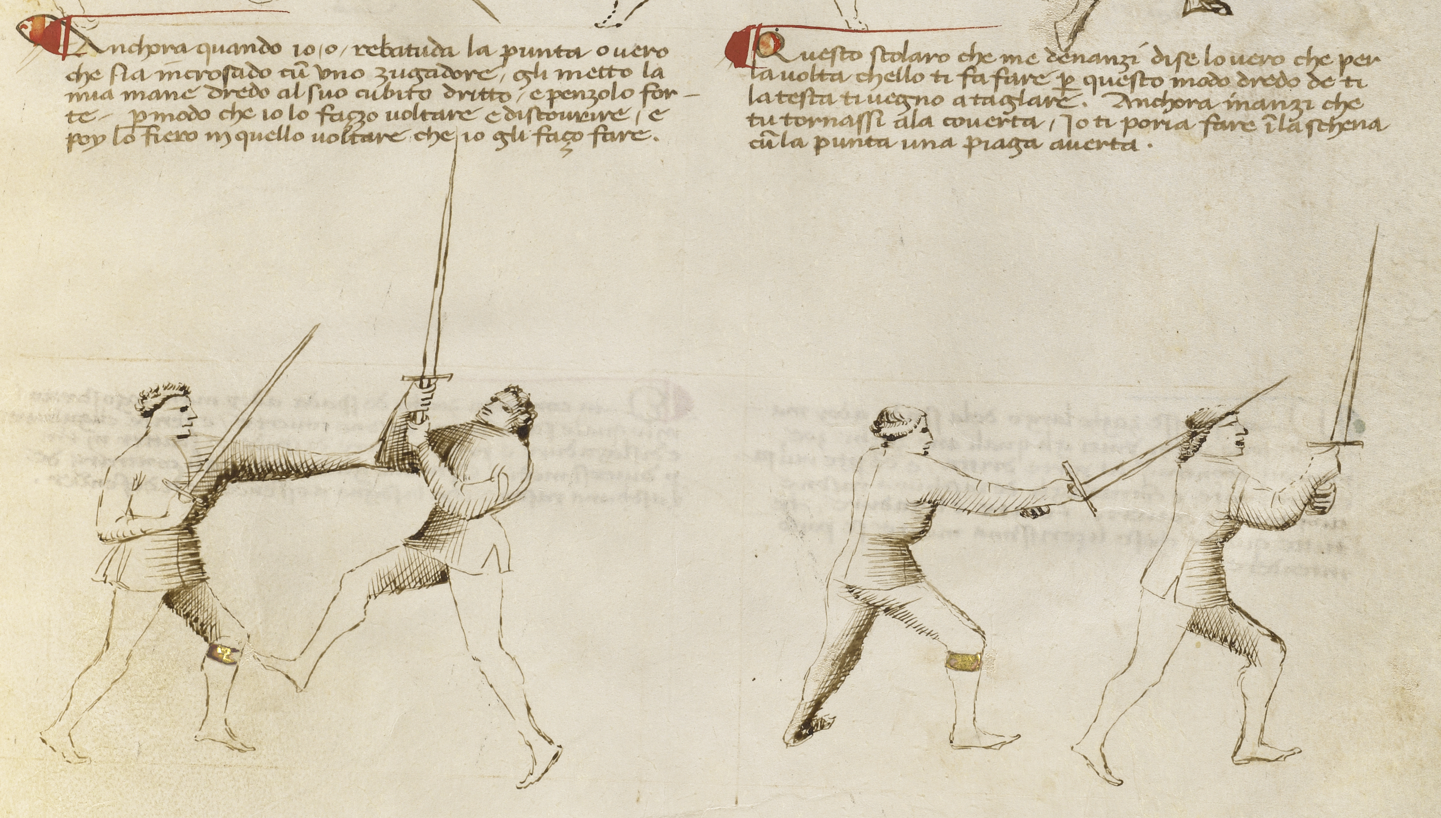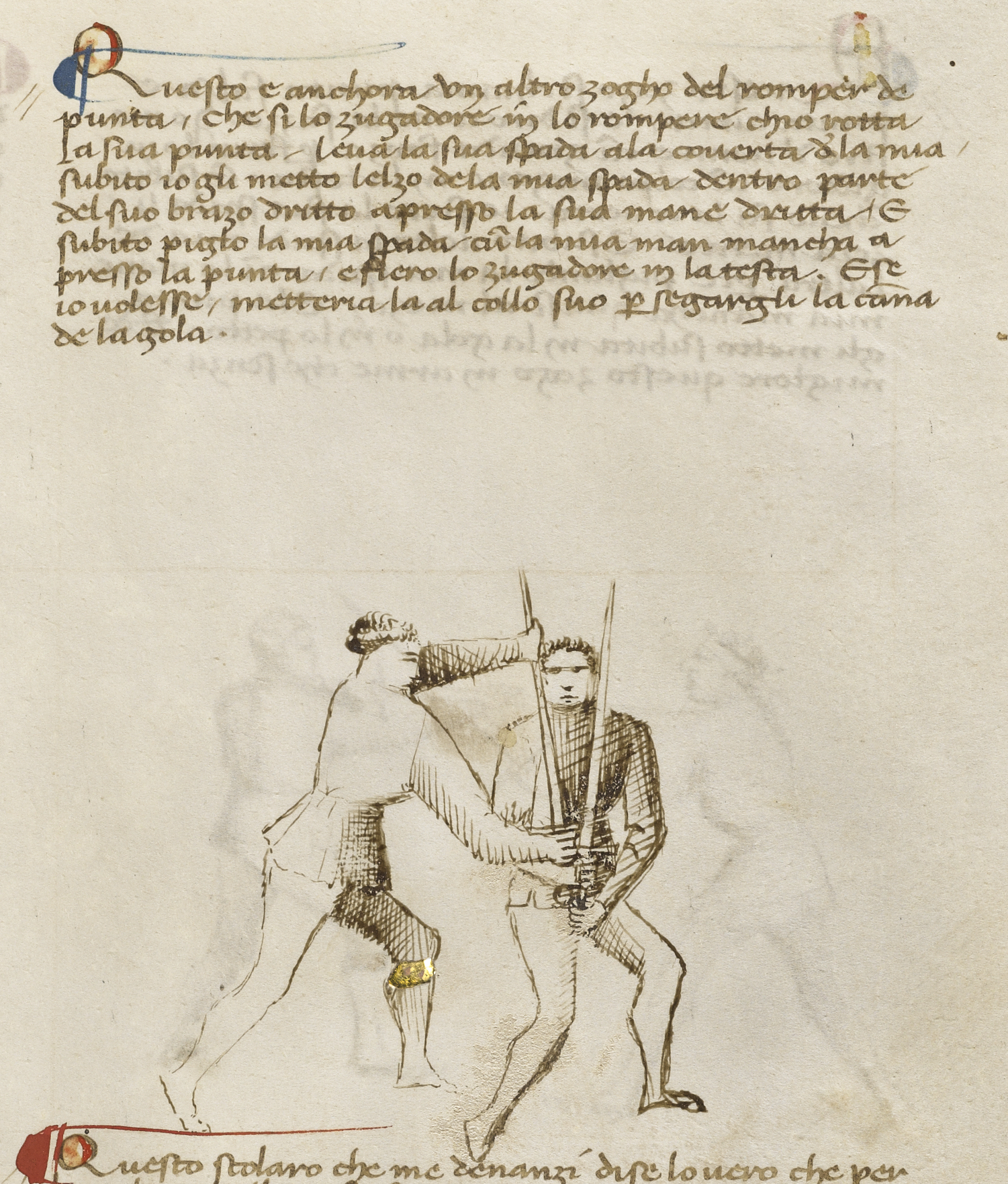 Questo e anchora un altro zogho del romper de punta, che si lo zugadore in lo rompere ch’i’o rotta la sua punta, leva la sua spada ala coverta de la mia, subito io gli metto l’elzo de la mia spada dentro parte del suo brazo dritto apresso la sua mane dritta, e subito piglo la mia spada cum la mia man mancha apresso la punta, e fiero lo zugadore in la testa. Ese io volesse, metteria la al collo suo per segargli la canna de la gola.