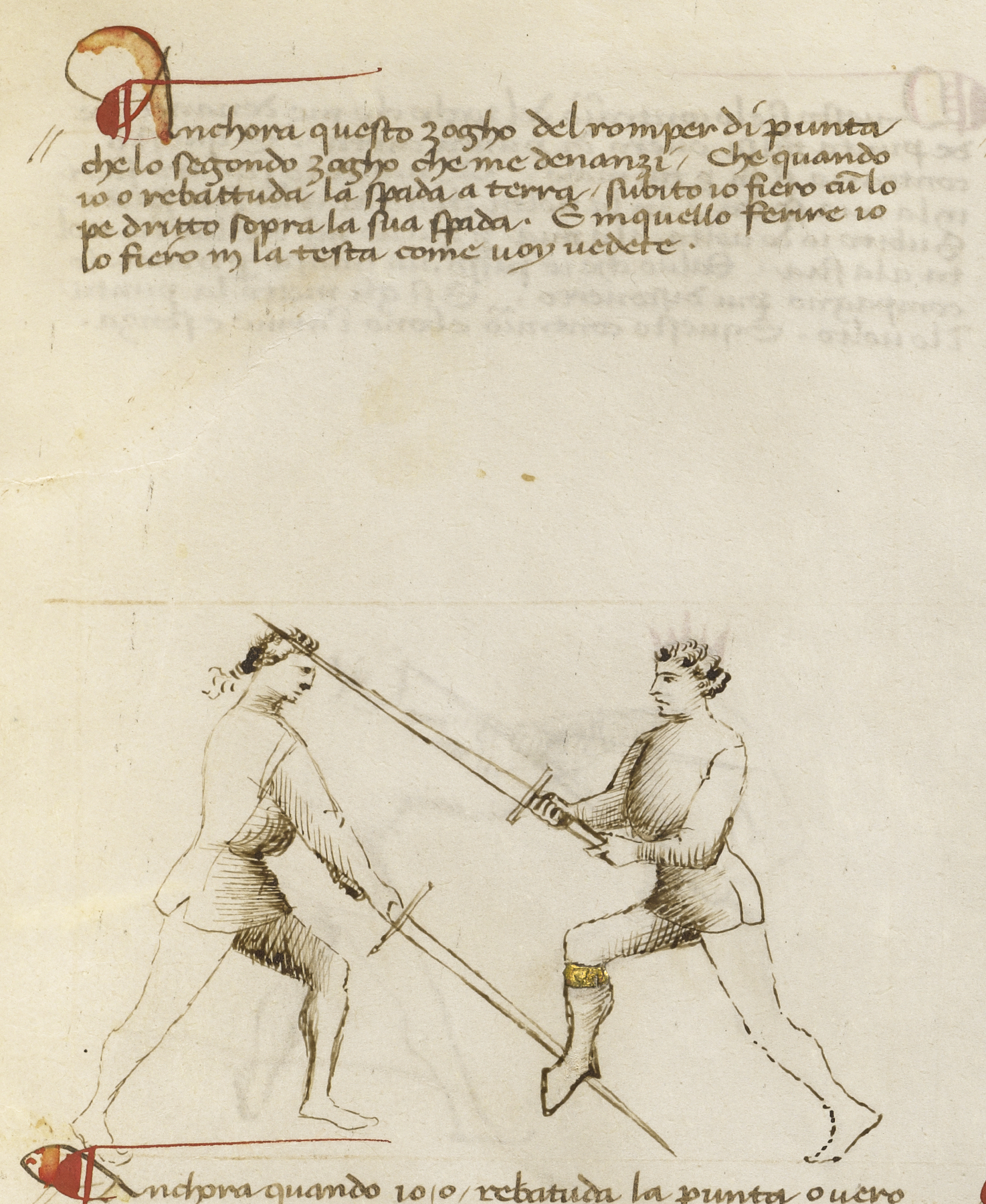 Anchora questo zogho del romper di punta ch’e lo segondo zogho ch’e me denanzi. Che quando io o rebattuda la spada a terra, subito io fiero cum lo pe dritto sopra la sua spada. E inquello ferire io lo fiero in la testa come voy vedete.