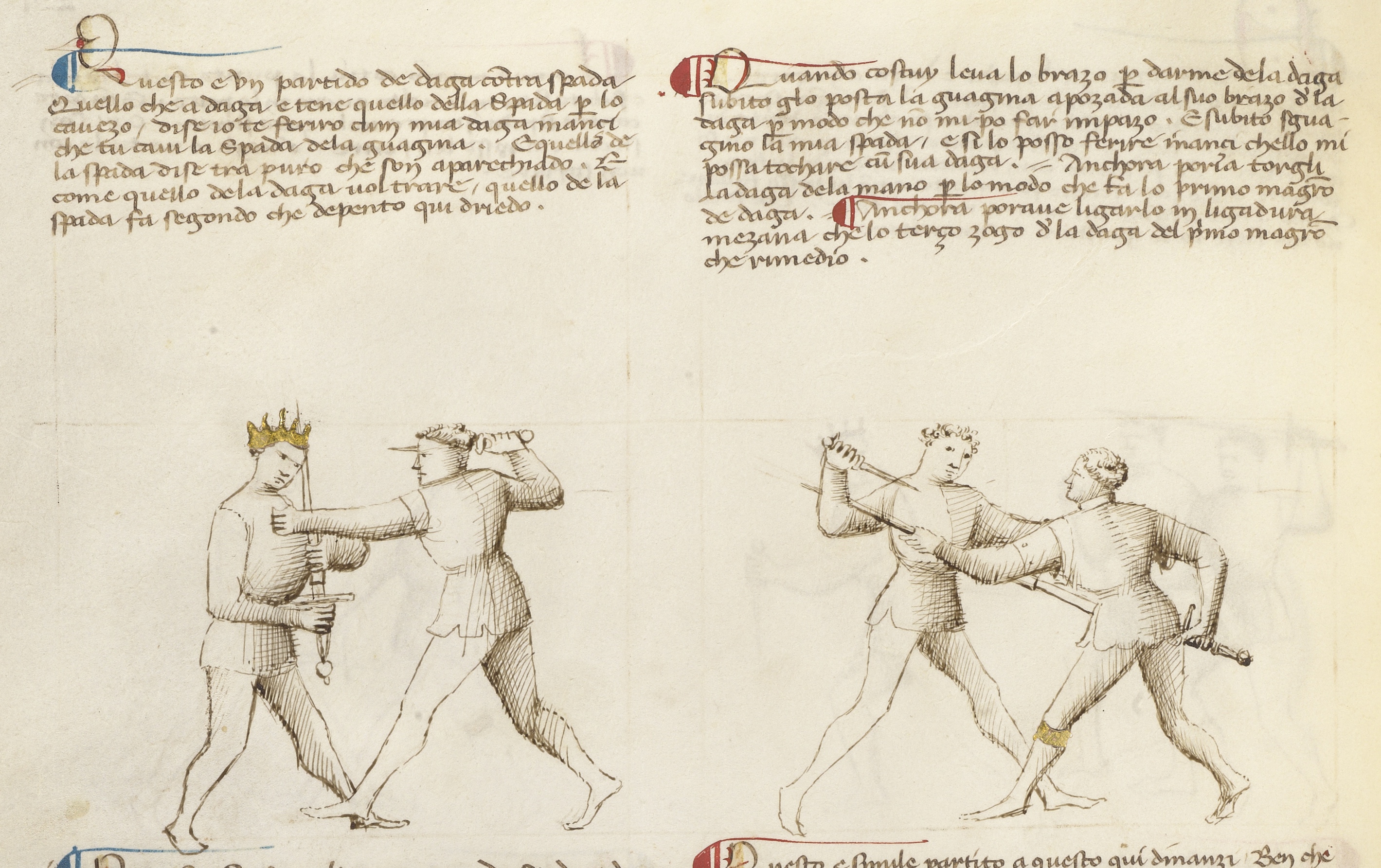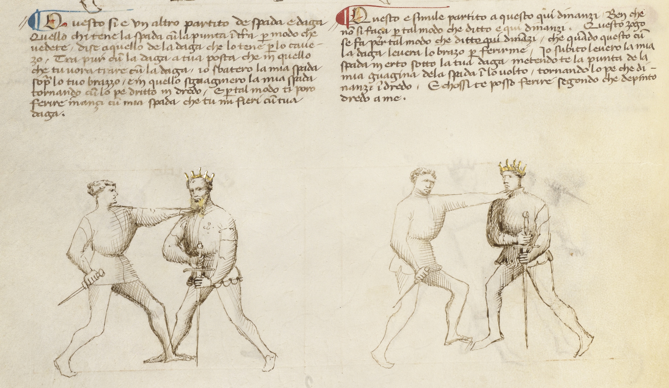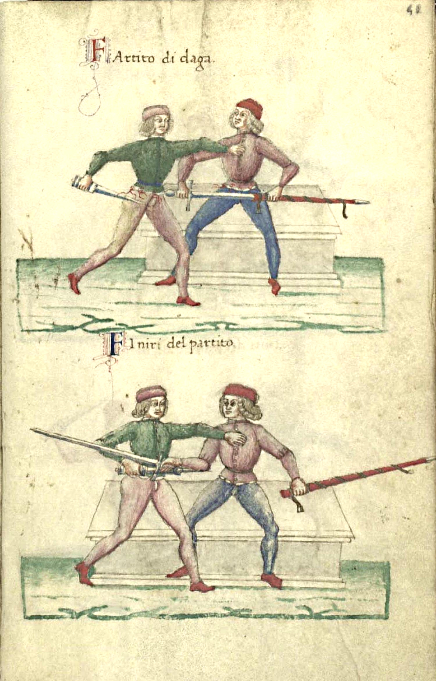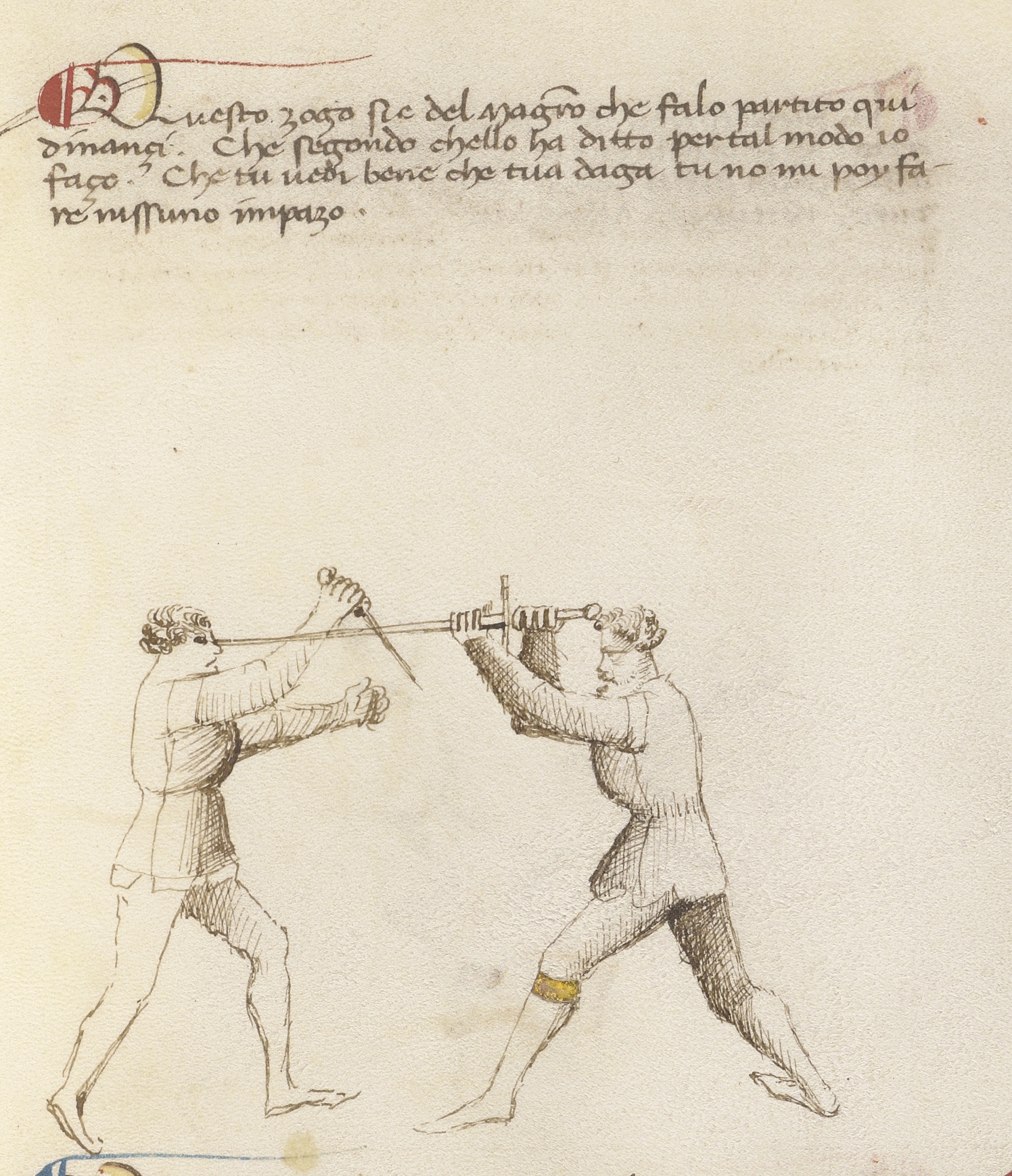 Questo e un partido de daga contra spada. Quello che a daga e tene quello della Spada per lo cavezo dise io te feriro cum mia daga inanci che tu cavi la spada dela guagina. E quello de la spada dise tra puro che son aparechiado. E come quello dela daga vol trare, quello de la spada fa segondo che depento qui dredo.