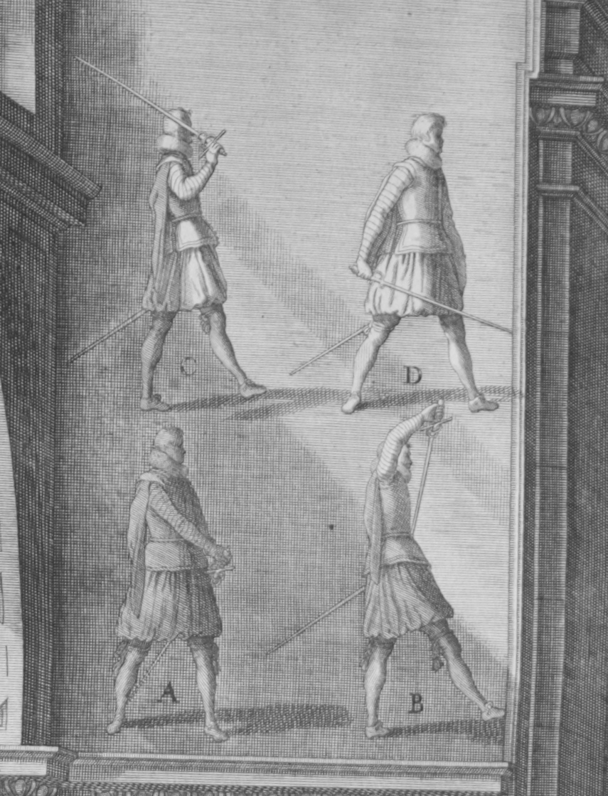 Under the title “Way to Place the Hand on the Sword” (as I would translate it) he simply tells us to step back with the right foot, and extend your arm (presumably with the sword attached) in prima (above the shoulder), unless you have your left foot forwards, in which case you can unsheathe the sword without moving your feet. And if you have other weapons (cape or dagger), then draw your left foot back while presenting the sword in quarta (on your left) to keep the opponent away while you sort out your weapons.