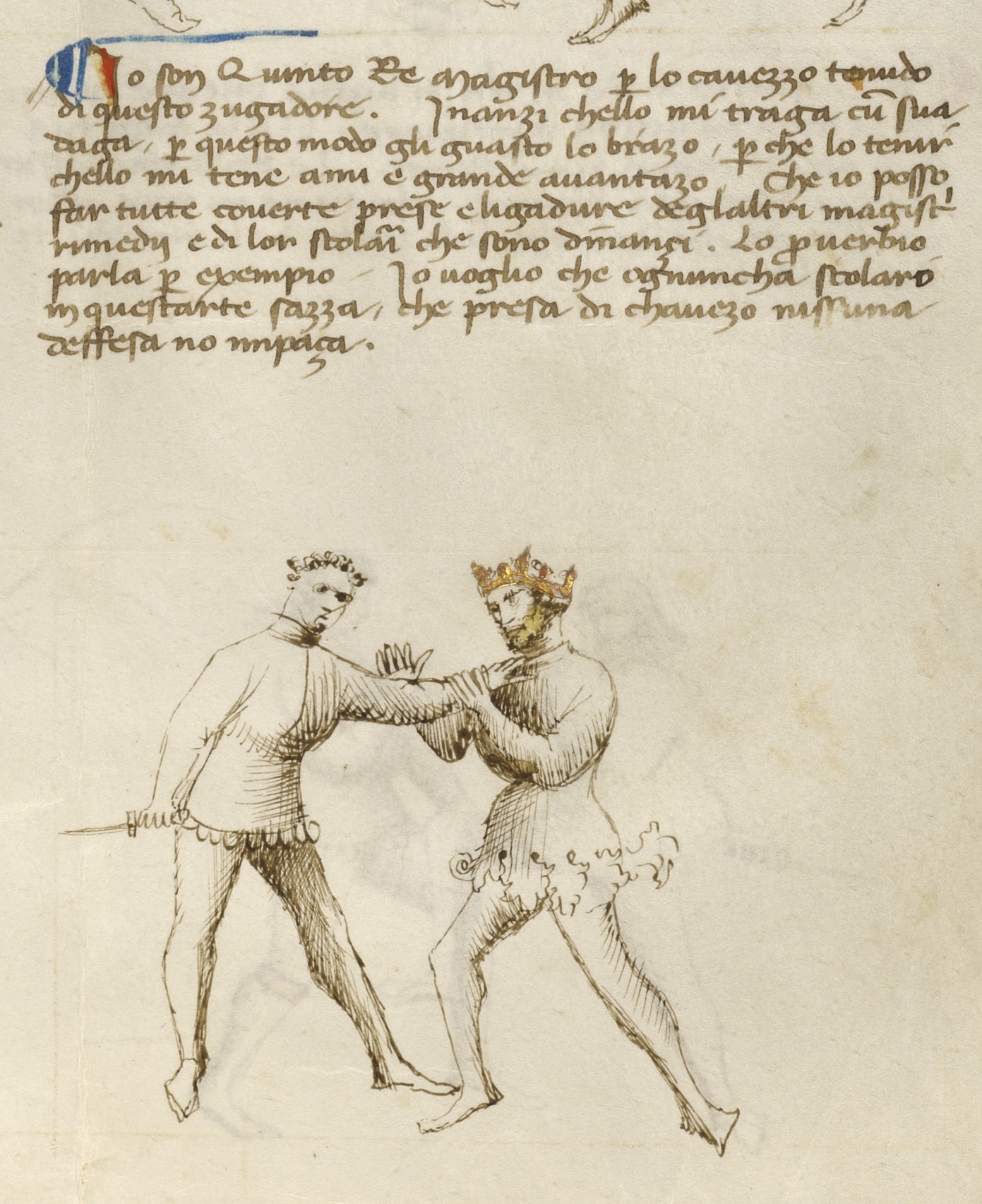 Io son Quinto Re Magistro per lo cavezzo tenudo di questo zugadore. Inanzi ch’ello mi traga cum sua daga, per questo modo gli guasto lo brazo, per che lo tenir ch’ello mi tene a mi e grande avantazo. Che io posso far tutte coverte, prese e ligadure degl’altri magistri rimedii, e di lor scolari che sono dinanzi. Lo proverbio parla per exempio. Io voglio che ognun ch’ascolaro in quest’arte sazza, che presa di chavezo nissuna deffesa no impaza.