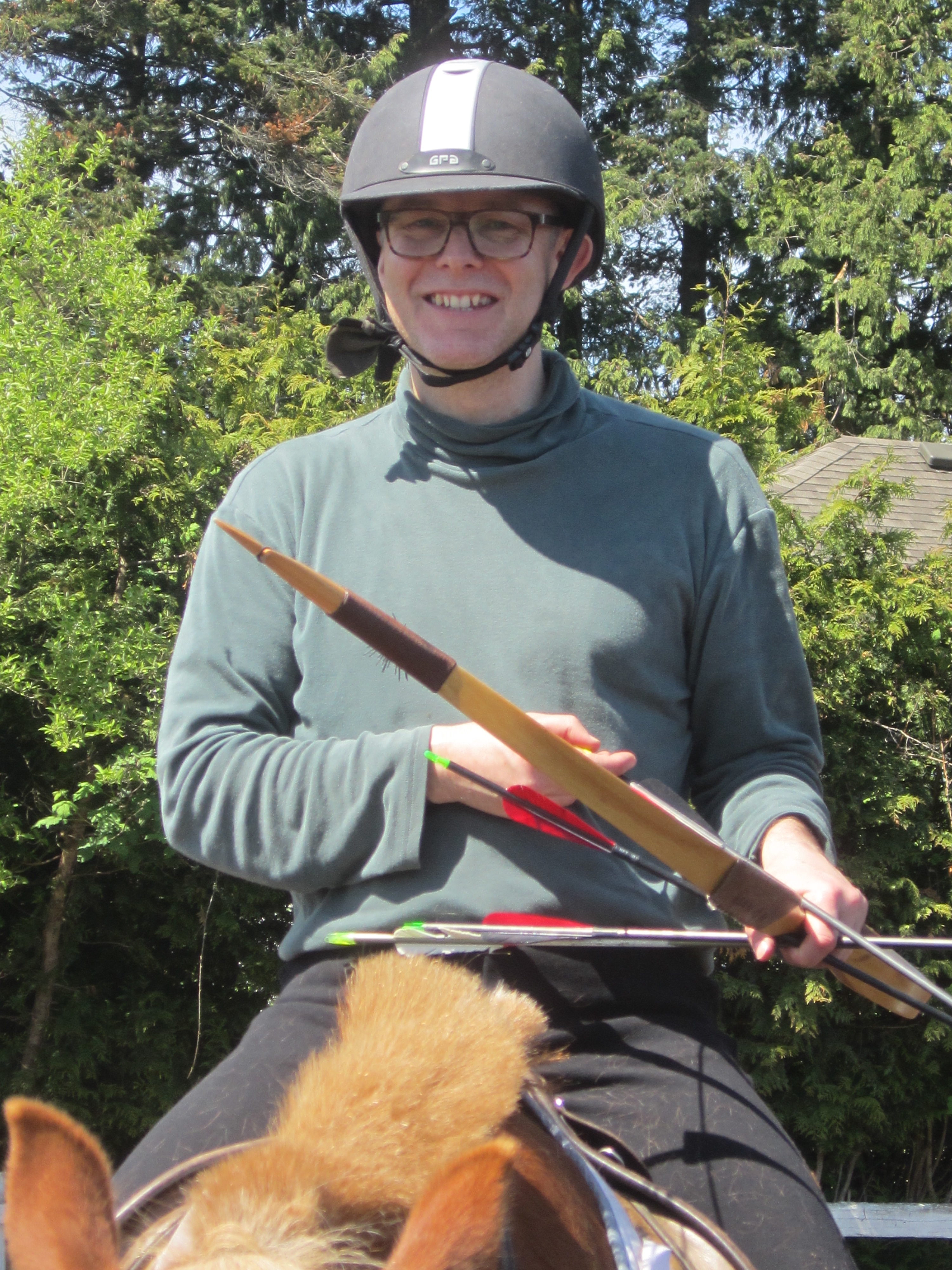 This photo was taken during what I think of as “Guy and Jen's Day of Fun!”, where Jennifer Landels took me out to her training facility, and we spent the day doing mounted archery and mounted swordsmanship. I wrote it up in detail here.