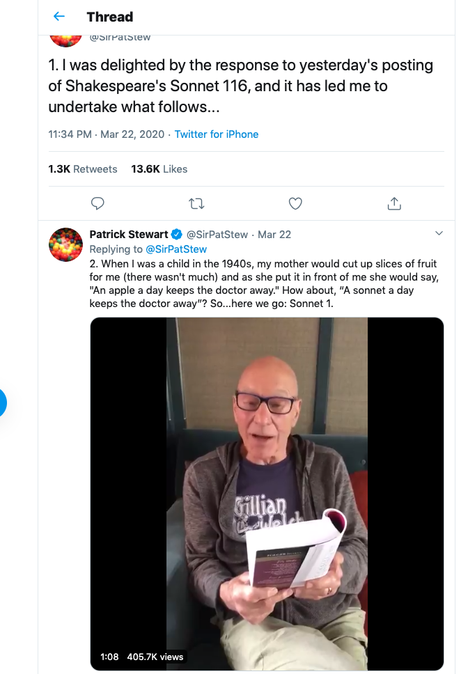 4) Help others. There is nothing more empowering. It can be super-simple. Patrick Stewart, Captain Picard himself, is reading one Shakespeare sonnet per day aloud. I think it’s only on Twitter, but here’s a screenshot: