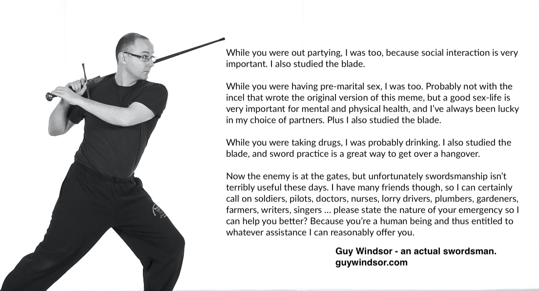 Well said, sir. That meme paints a sorry picture of a practioner. It has been quite some years since we have had an enemy requiring swordperson’s attention at the gates. (Although, people rarely use their own picture in memes, usually just some random image that got attention. So it might be that someone got lots of unwanted attention when they are just learning the basics..)