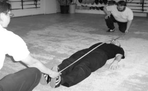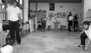 We then measured out the same length from the centre of the thrusting target to a point on the floor, and marked the distance off with tape.