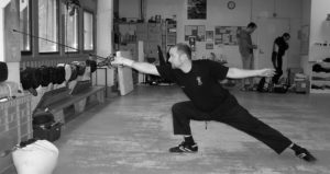 Having done this myself, I then repeated the whole procedure for a small class of rapier students. Of course, with different length bodies and weapons, the maximum possible lunge was a different absolute length for each student. Out of six students, four men and two women, both women could reach their maximum lunge, and none of the men, primarily due to hip flexibility. However, none could easily recover, or felt comfortable in their maximum positions. More importantly, each student caught sight of an exact, measurable goal; to be able to lunge easily to the maximum distance, and recover fluidly to the correct guard position.