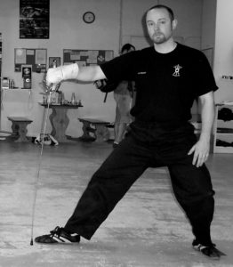 Standing on that mark, I placed my sword on the floor and lunged to its length (it has a 42″ blade).
