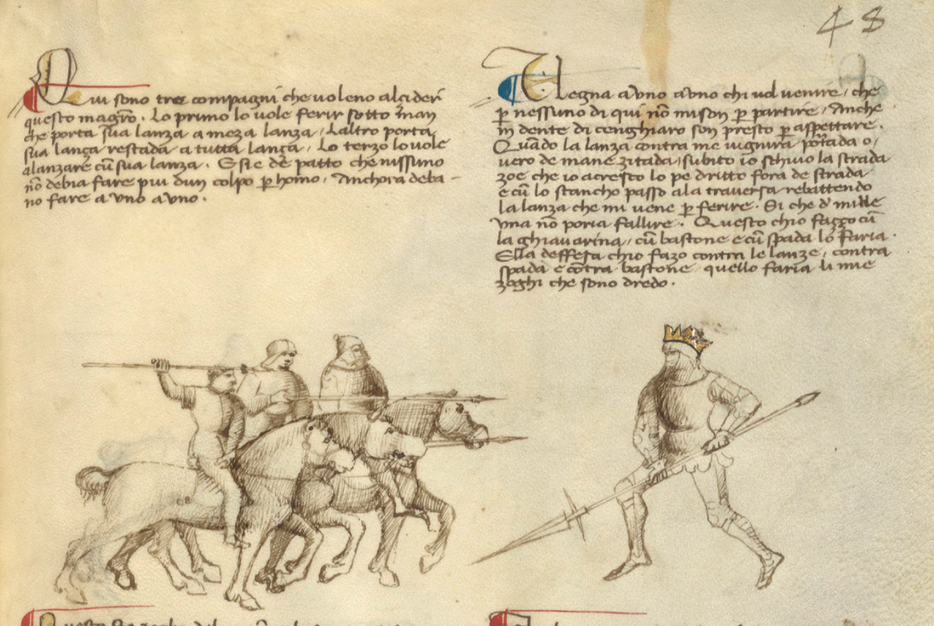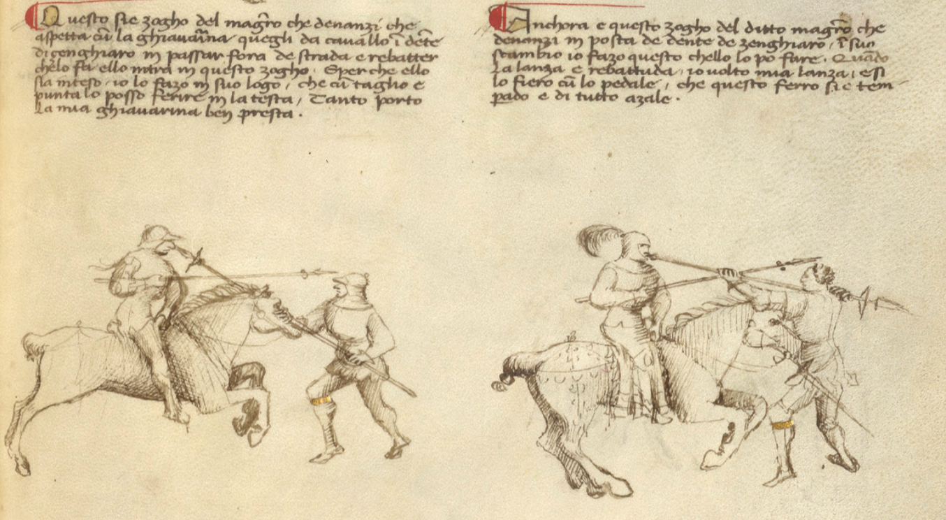 La presa del mie magistro non abandonai in fin che questo zugador vidi vidi che non lassava la presa. E luy se inchina cum la daga in verso terra. E io subito piglai la sua mane cum la mia mancha per enfra le soi gambe. E quando la sua mane hebbe ben afferada, dredo de lu passai. Comomo possete vedere chello non si po discavalcare senza cadere. E questo zogho che me dredo posso fare. La man dritta dela daga lassa, e per lo pe lo vegno a piglare per farlo in terra del tutto andare, e a torgli la daga no mi po manchare.