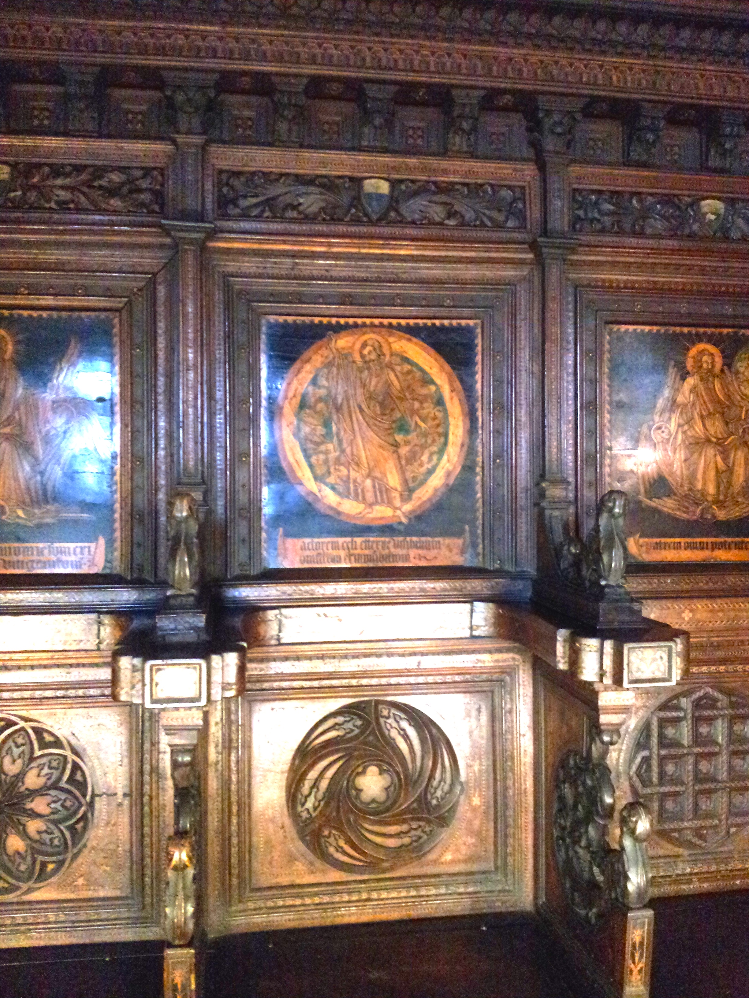 I’m talking about intarsia, marquetry, call it what you will. Pictures in wood. Like in this choir stall, from the Museo Civico, Siena: